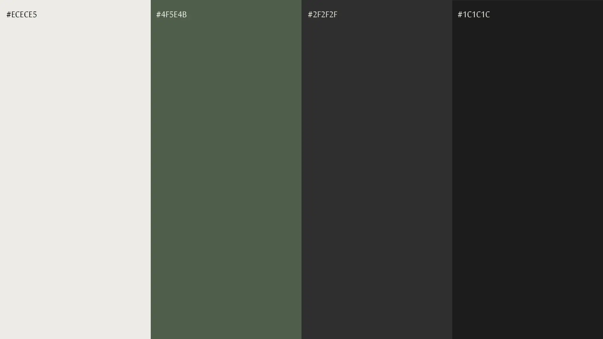 I carefully curated color palette embodies calm sophistication. The soft beige (#ECECE5) brings a sense of serenity and warmth, while the deep olive green (#4F5E4B) grounds the brand with timeless elegance. This palette sets the tone for every guest touchpoint, evoking a feeling of comfort and refined taste.